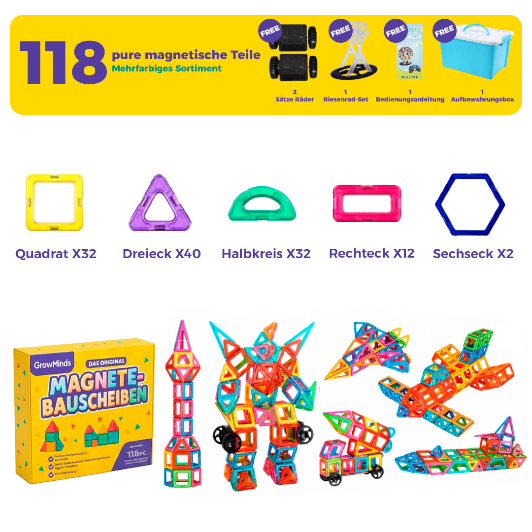 Suchst du nach einer sinnvollen Alternative zu Handy, Tablet & TV? Mit den farbenfrohen GrowMinds™ Magnetbauscheiben kann dein Kind seiner Kreativität freien Lauf lassen und faszinierende Bauwerke erschaffen – vom Turm bis zum Raumschiff! Während du entspannt deinen Kaffee genießt, taucht dein Kind spielerisch in die Welt der Formen, Farben und ersten physikalischen Prinzipien ein.